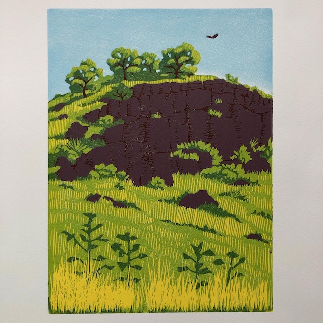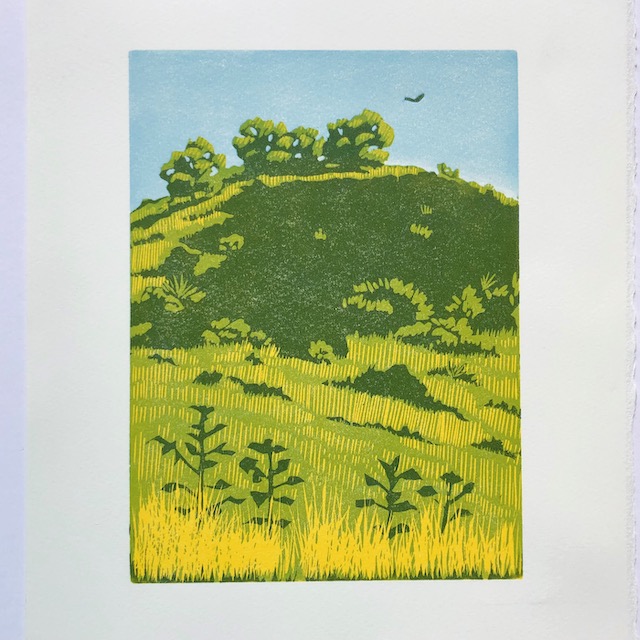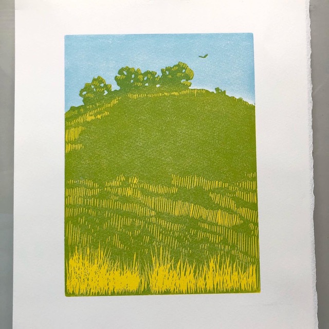 Here are some images below to show the progress of making the image. I didn’t make a photo of the second layer of color. The yellow layer overlapped the sky in order to print the trees on top of the hill.