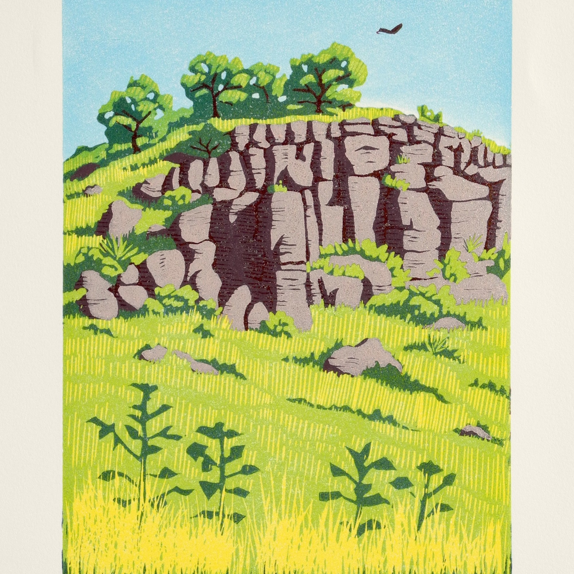 I’ve been so busy with road trips, learning new songs for a birthday celebration concert and other stuff since I began work on this print, I’ve neglected to post anything about it while in process. This print represents a few firsts for me: first landscape print, first time I’ve used opaque color, first print made with our new Woodzilla press. I’ve been wanting to do a bigger Davis Mountains (west Texas) print since we visited there this time last year. I have a few sketchbook drawings I made from the campground and some photos I’m using for reference. The complexity of the subject and uncertainty about how to approach the print kept being reasons to put it off. So, I decided I’d experiment with this little print and try to figure out some stuff. I think I’m ready to do a larger print now. I had bought a tube of opaque white ink to use on this so that I could work from the darkest transparent color back toward light values to print the rocks. With most of the print I worked from light to dark, as I usually do, and the the last two layers of ink were printed with colors mixed with white to print the rocks’ shadows and sunlit areas. Kept me from having to make a second lino block just for the rocks. I ended up with seven layers of color on this print. The frequent interruptions and trips gave the print time to dry between layers so everything worked out ok. I’m ready to get back to a more regular routine though. This print is for sale on the prints page of chetmink.com